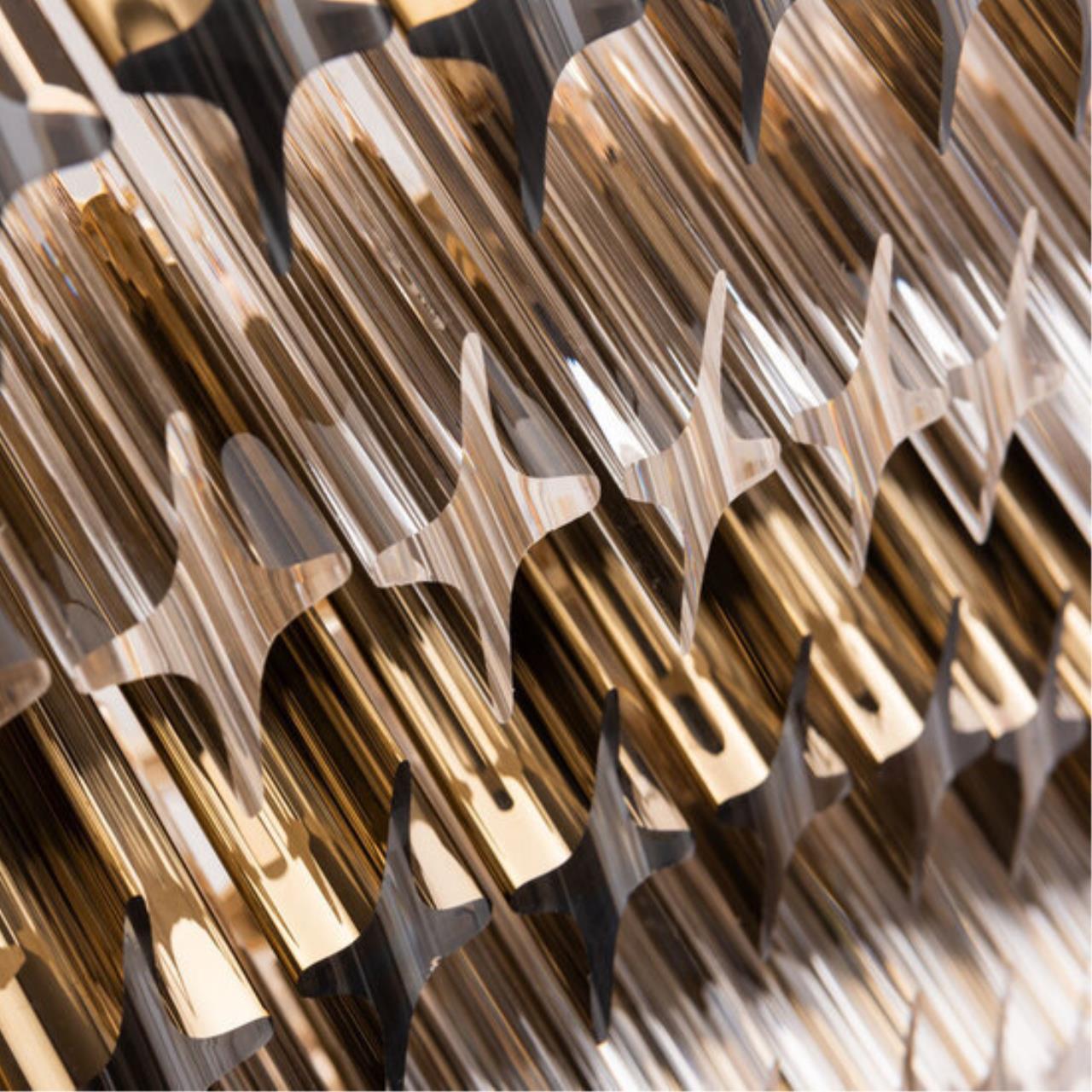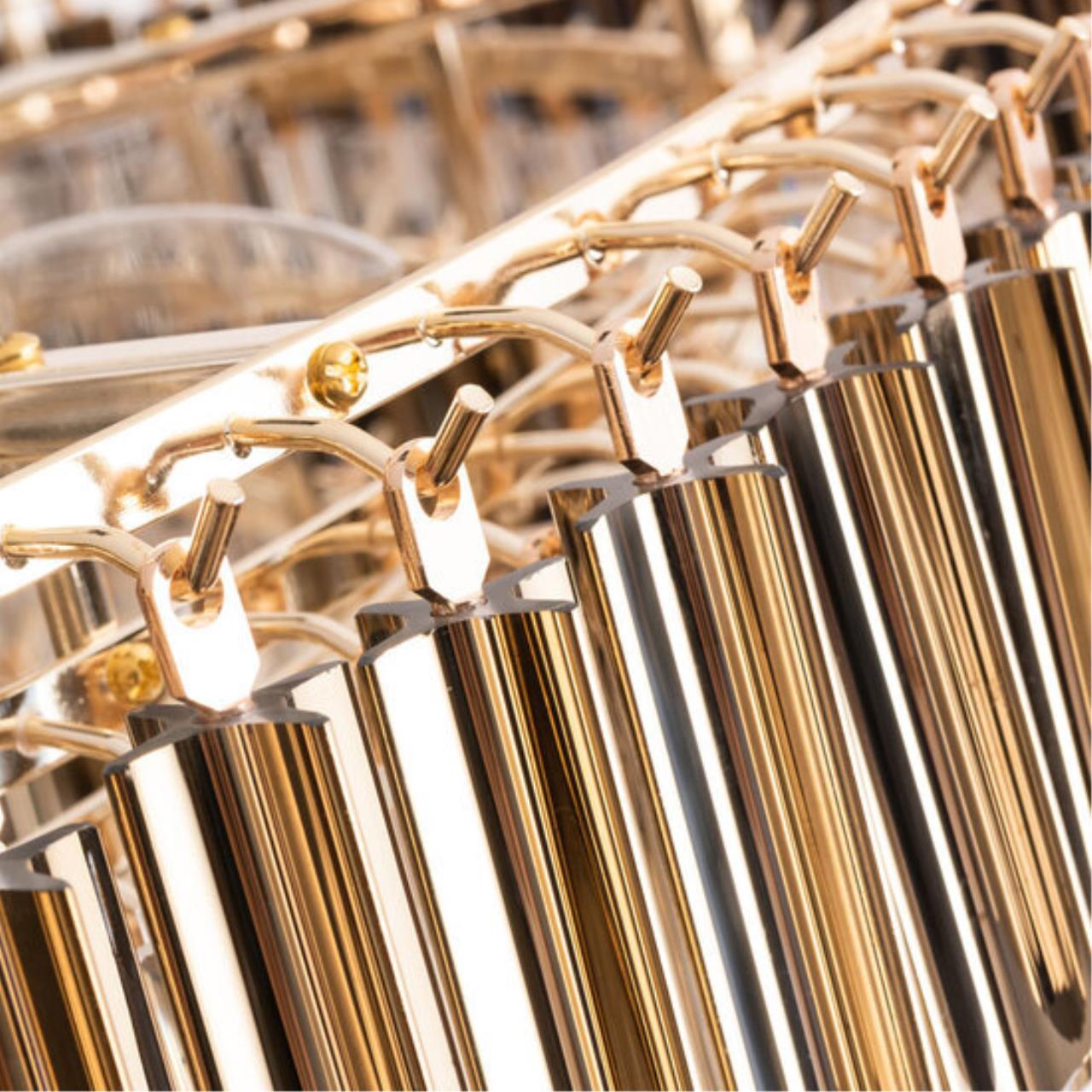 Свободно свисающие хрустальные декоративные элементы, расположенные в несколько рядов, образуют объемную конструкцию, которая при движении воздуха в помещении начинает «звучать». Сочетание золотых и прозрачных декоративных подвесок создают яркий, ослепительный образ модели. В коллекции четыре люстры разных размеров, есть возможность подобрать в помещения разных форматов. Большое бра может быть дополнением в ансамбль с люстрой, а может быть самостоятельным украшением интерьера.