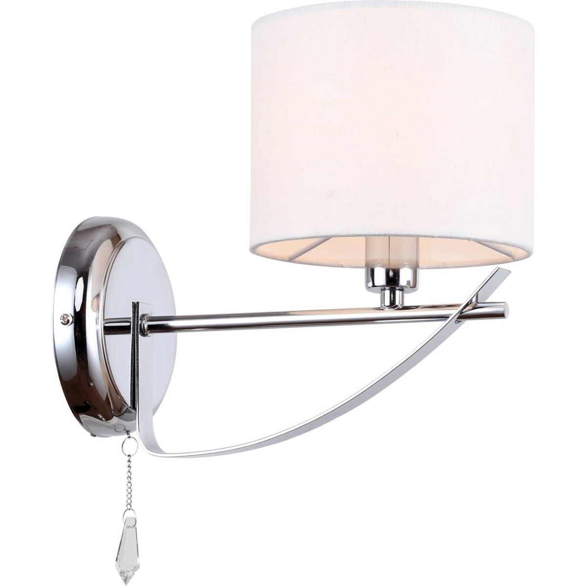 Светильник настенный из коллекции Dora / Дора выполнен из металла, гальванизированного в цвет хрома, и декорирован цилиндрическим текстильным абажуром белого цвета с термостойким акрилом внутри и хрустальной подвеской каплевидной формы.
