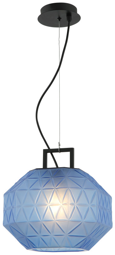 Светильник подвесной из коллекции Chest / Чест выполнен из металла, окрашенного в черный цвет, и декорирован плафоном многогранной формы из фактурного стекла, окрашенного в синий цвет.
