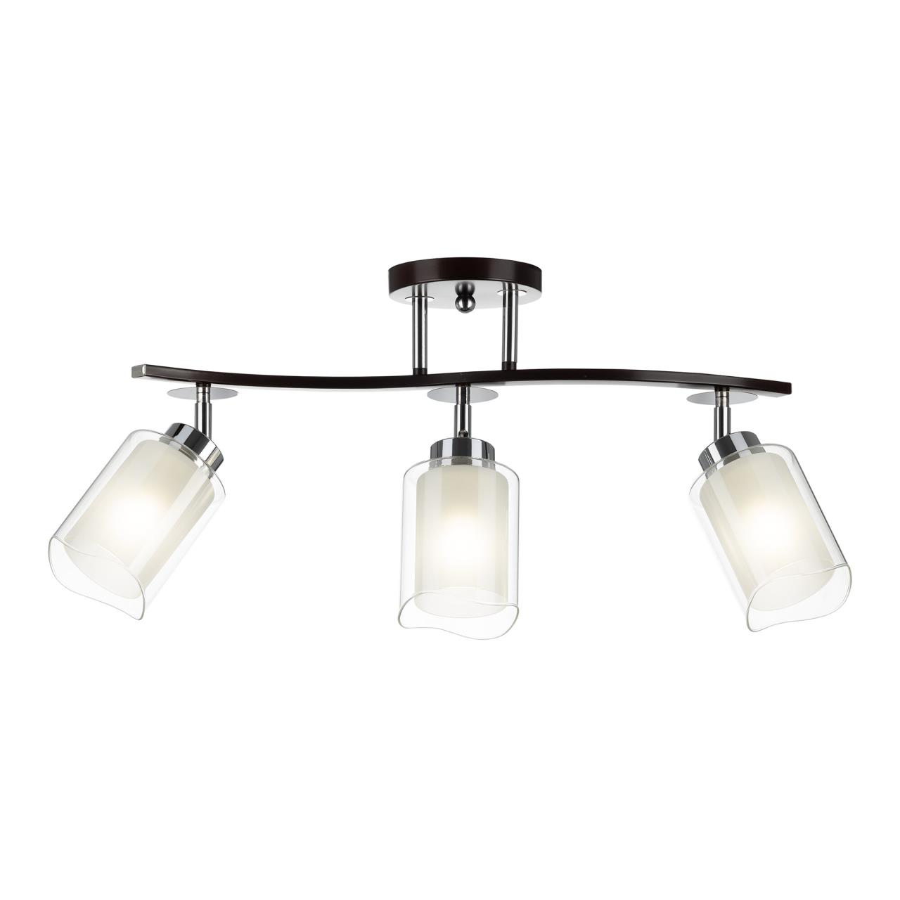Потолочный светильник коллекции Фортуна на 3 рожка выполнен в цвете венге с декоративными хромовыми элементами. Плафоны оснащены поворотным механизмом, что позволяет зафиксировать их в любом положении. Это технологическое решение даёт возможность изменить дизайн светильника, а также оптимально распределить освещение в помещении. Цоколь патрона Е27 с ограничением по мощности для ламп накаливания до 75 ватт, светодиодные лампочки можно ставить любой мощности. Плафоны выполнены из стекла, наружное прозрачное, а внутреннее белое матовое. Каркас люстры сделан из металла. Площадь освещения до 11 квадратных метров. Тип крепежа: потолочный. Размер: Длинна: 56,5 см, Высота: 25 – 33 см, Ширина: 13 см.